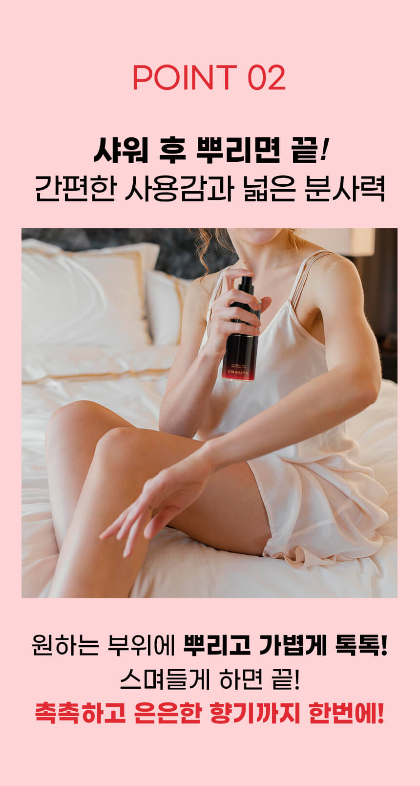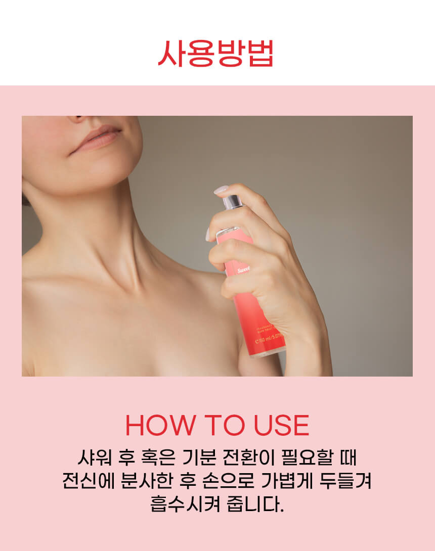 Cách dùng: Sử dụng hàng ngày. Để mùi hương được toả đều và lưu lại lâu hơn, nên xịt vào những vùng: cổ và sau gáy, cổ tay, giữa ngực và sau đầu gối. Xịt cách da khoảng 15-20cm và để khô tự nhiên. * Mẹo: Sử dụng sau khi tắm và kết hợp với dưỡng thể để lưu hương lâu hơn.