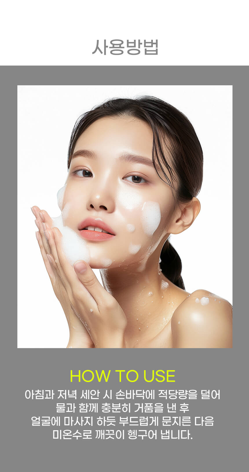 Cách dùng: Làm ướt da mặt, lấy một lượng vừa đủ sản phẩm ra tay, tạo bọt và nhẹ nhàng massage lên da theo chuyển động tròn. Rửa sạch lại với nước. Sử dụng mỗi ngày vào buổi sáng và tối. Tránh tiếp xúc trực tiếp với mắt.