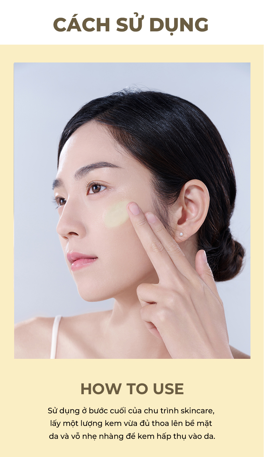 Sau khi thoa toner và ampuole serum . Lấy một lượng vừa đủ thoa đều lên bề mặt da, vỗ nhẹ nhàng cho thẩm thấu vào da.