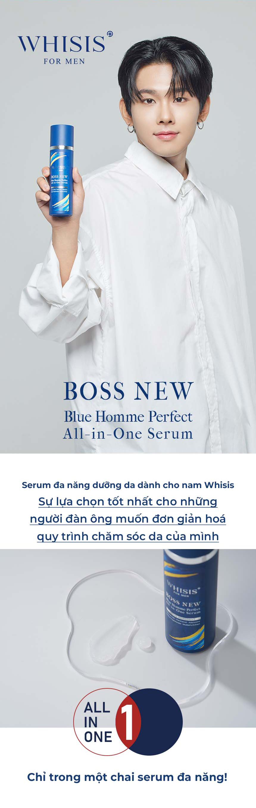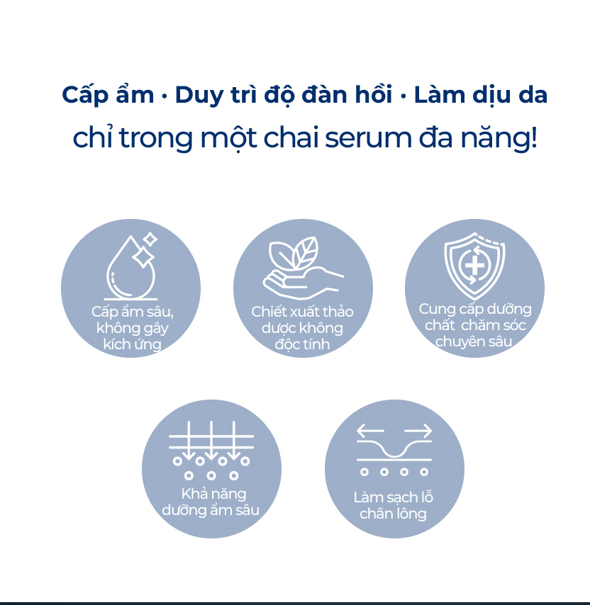 Công dụng: Cấp ẩm, duy trì độ đàn hồi, làm dịu da chỉ trong 1 chai serum đa năng. Cung cấp cùng một lúc đa chức năng của toner và kem dưỡng ẩm .Chăm sóc độ ẩm cần thiết và dinh dưỡng hoàn chỉnh chỉ với một chai serum. Kết cấu trong suốt, mỏng nhẹ, hấp thụ ngay tức thì sau khi thoa, không gây dấp dính.
