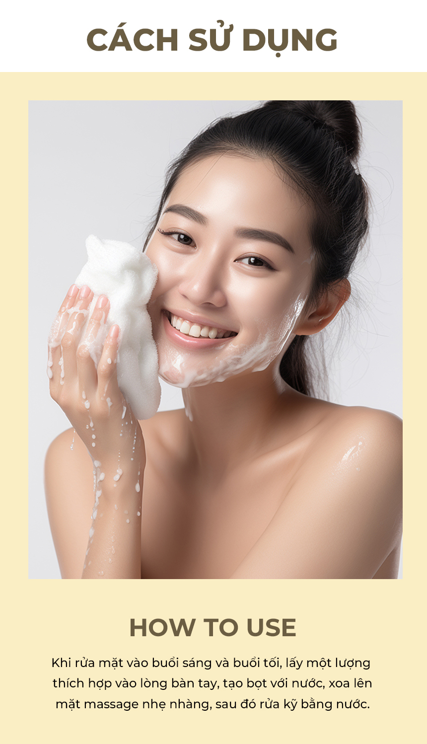 Khi rửa mặt vào buổi sáng và buổi tối, lấy một lượng thích hợp vào lòng bàn tay, tạo bọt với nước, xoa lên mặt massage nhẹ nhàng, sau đó rửa kỹ bằng nước.
