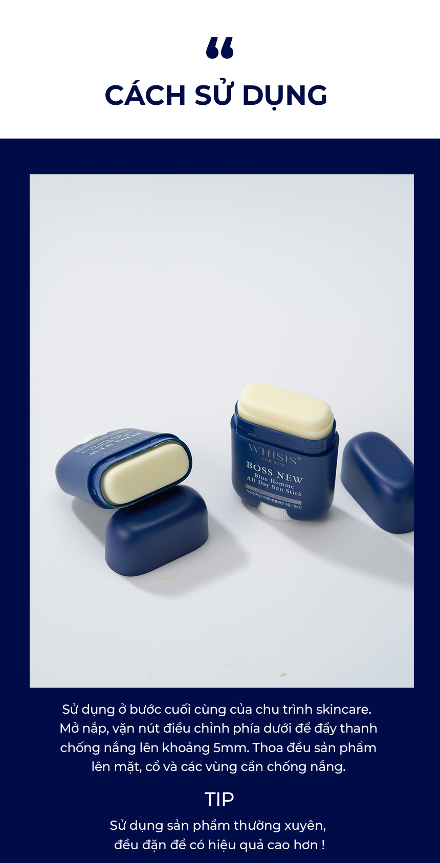 Rửa sạch mặt và sử dụng sản phẩm ở bước chăm sóc da cuối cùng. Mở nắp, vặn nút điều chỉnh phía dưới để đẩy thanh chống nắng lên khoảng 5mm. Thoa đều sản phẩm lên mặt, cổ và các vùng cần chống nắng.