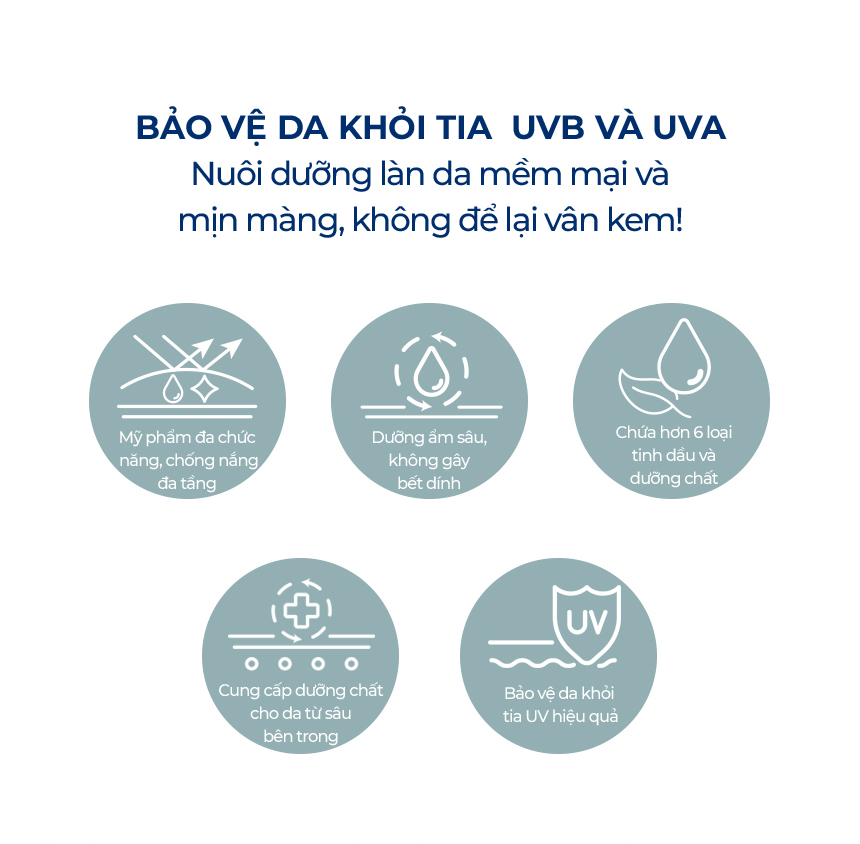 Tạo hàng rào bảo vệ da.Vừa chống nắng vừa nuôi dưỡng làn da mềm mại và mịn màng, không để lại vân kem. Thuận tiện ~ mỏng nhẹ, không bết dính, chống nắng an toàn trong suốt ngày dài. Chứa tới hơn 6 loại tinh dầu và dưỡng chất để kiểm soát cân bằng dầu nhờn và độ ẩm. Bảo vệ da mọi lúc, mọi nơi: trong nhà , ngoài trời , đi bơi, các hoạt động thể thao.