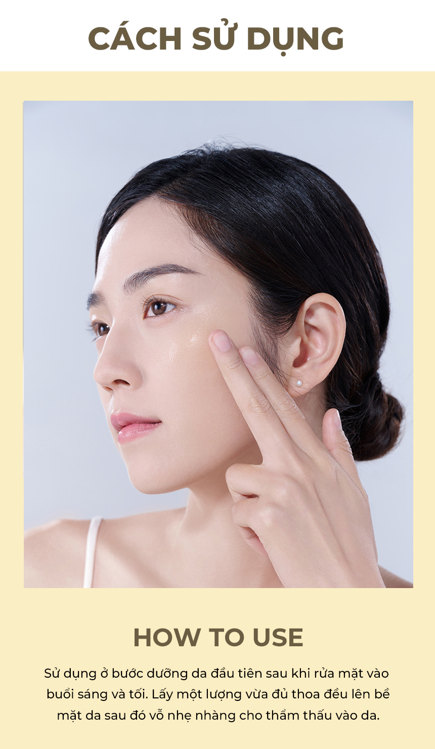 Sử dụng ở bước dưỡng da đầu tiên sau khi rửa mặt vào buổi sáng và tối . Lấy một lượng vừa đủ thoa đều lên bề mặt da, vỗ nhẹ nhàng cho thẩm thấu vào da.