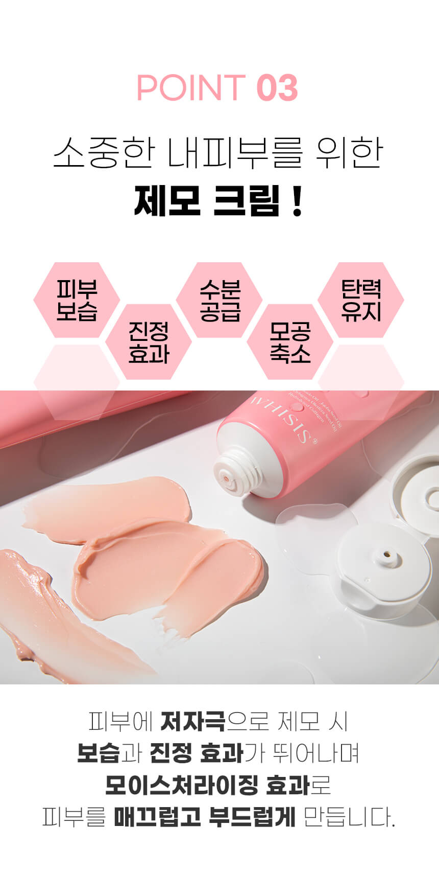 Công dụng: Giúp làm sạch vùng lông không mong muốn trên da một cách nhẹ nhàng, sản phẩm còn chứa các chiết xuất thảo dược như: dầu trái bơ, dầu hạt babassu, dầu hạt jojoba, có thêm Panthenol (B5)và Collagen thủy phân, giúp giảm kích ứng và cải thiện tình trạng khô da sau khi tẩy lông