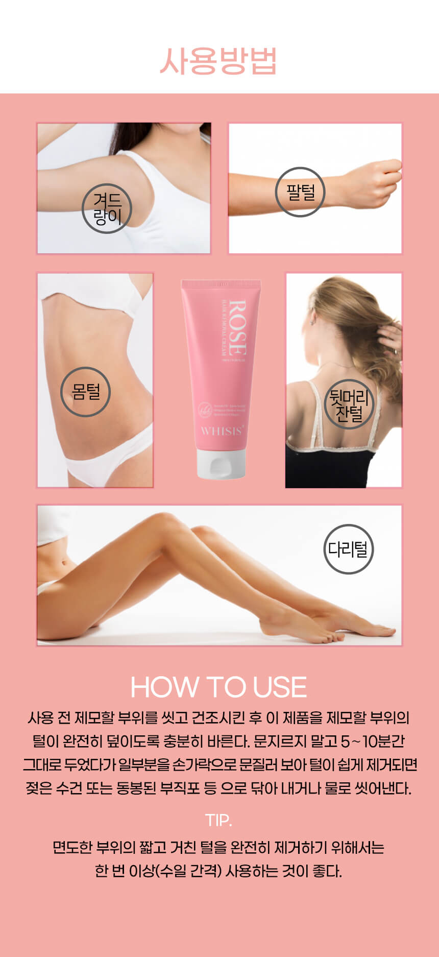 Cách dùng: Trước khi sử dụng, hãy rửa sạch và lau khô vùng da cần tẩy lông. Sau đó, thoa một lượng kem vừa đủ lên vùng cần tẩy sao cho lông được phủ hoàn toàn. Không xoa đều kem, để yên trong vòng 5–10 phút. Sau đó, dùng ngón tay chà nhẹ một vùng nhỏ để kiểm tra – nếu lông được loại bỏ dễ dàng, hãy dùng que gạt hoặc dùng khăn ẩm lau sạch rồi rửa lại bằng nước.